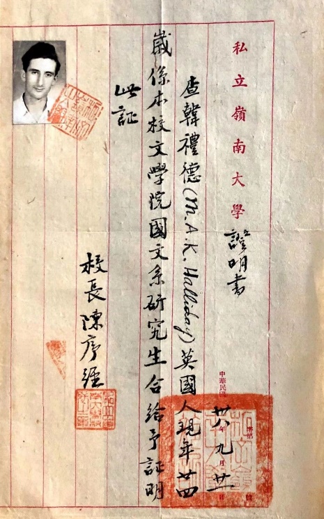 岭南大学陈序经校长为韩礼德出具的证明