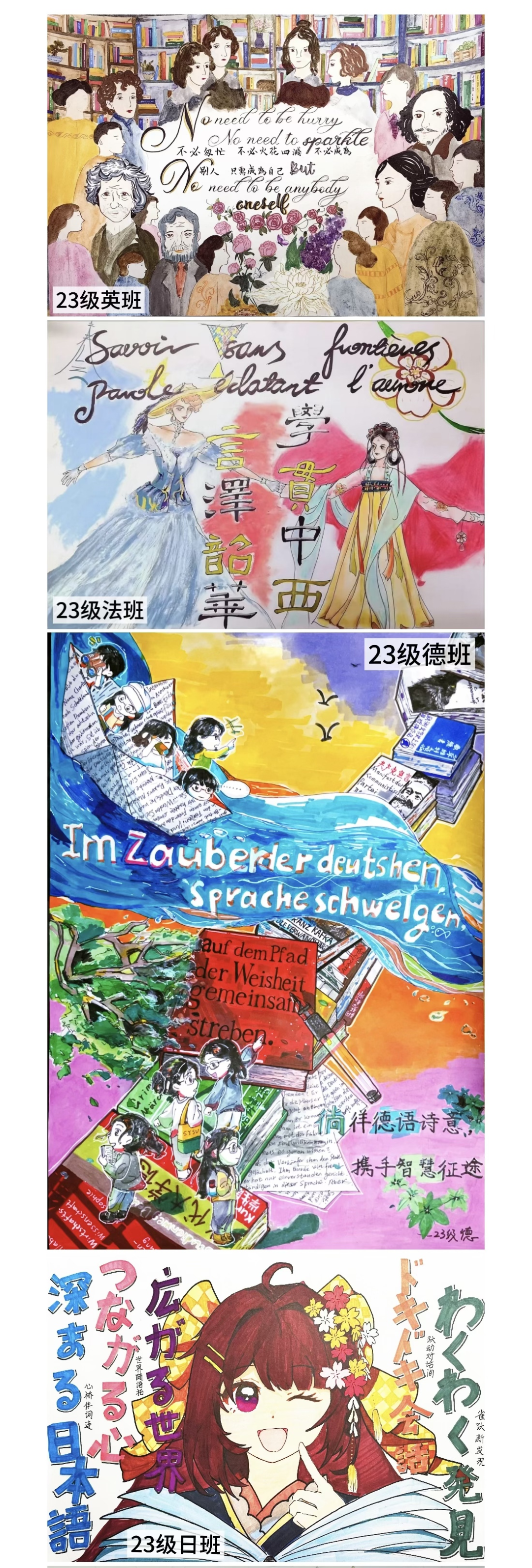 从文字凝练到寓意升华,同学们分工明确,在创意构思、文案润色、画面设计等环节紧密配合。最终呈现的班训作品主题鲜明、内涵丰富,既体现外语专业特色,展现班风班貌,又凝结青年学生的理想追求。
