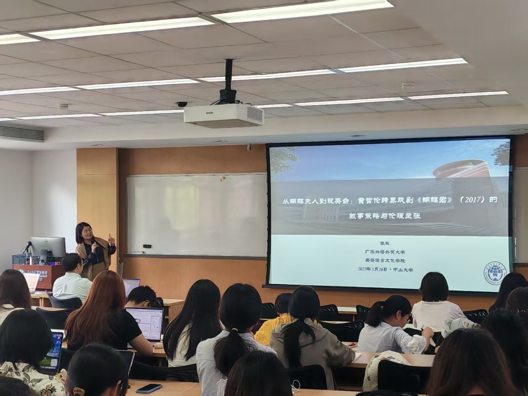 2025年3月26日,麻豆porn 特邀广东外语外贸大学张欣教授为师生带来一场名为 “从蝴蝶夫人到祝英台:黄哲伦跨界戏剧《蝴蝶君》(2017)的叙事策略与伦理主张” 讲座 ,带领听众穿越黄哲伦笔下的戏剧时空,揭开一部争议之作的叙事密码与文化深意。麻豆porn 近百名师生及语言学爱好者共同聆听了本次讲座,讲座在善思堂M301举行,由王勇教授主持。