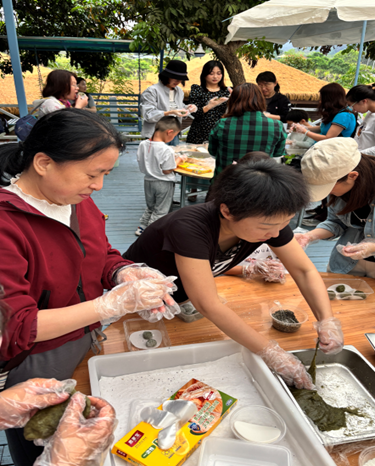 午餐过后,趣味十足的体验活动依次展开。首先是艾糍粑制作体验,工作人员详细讲解了艾糍粑的制作方法与养生功效,将焯烫好的新鲜艾叶剁碎,与糯米粉、白糖混合搅拌成翠绿面团,再包入花生碎、白芝麻等馅料,搓圆压模后蒸熟即可。大家热情高涨,分工协作、动手实践,揉面团、包馅料、压造型,忙得不亦乐乎,不一会儿,一个个青翠诱人、香气扑鼻的艾糍粑便新鲜出炉,咬一口软糯香甜,唇齿间满是艾草的清香与春日的滋味。
