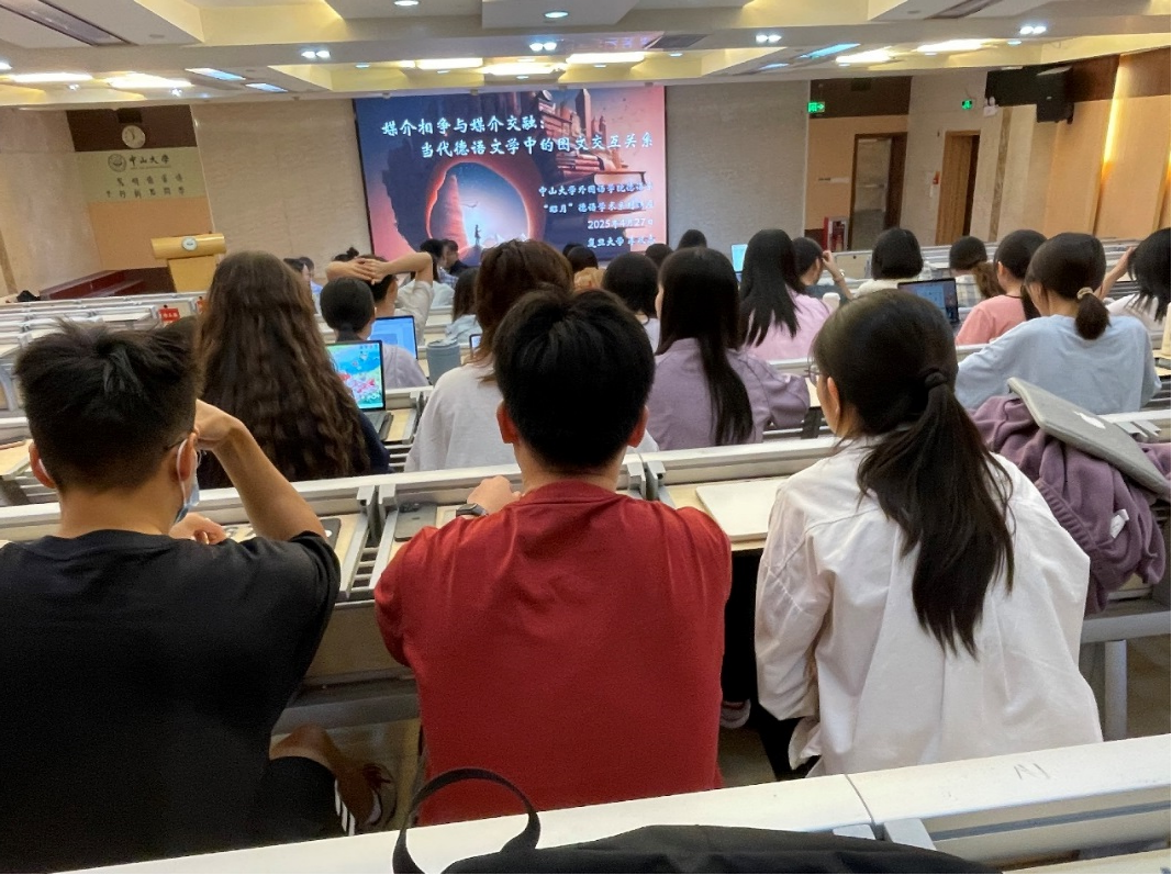 2025年4月27日晚,“昭月”德语学术系列讲座第二期在学院101讲学厅举行,复旦大学德文系主任李双志教授受邀作“媒介相争与媒介交融:当代德语文学中的图文交互关系”主题讲座。本次讲座吸引了德语系、哲学系、中文系等院系近百名同学和老师参加,现场学术氛围浓厚。讲座由德语系主任杨劲教授主持。