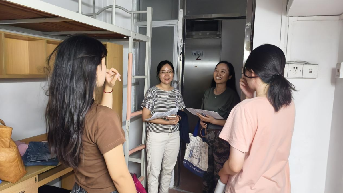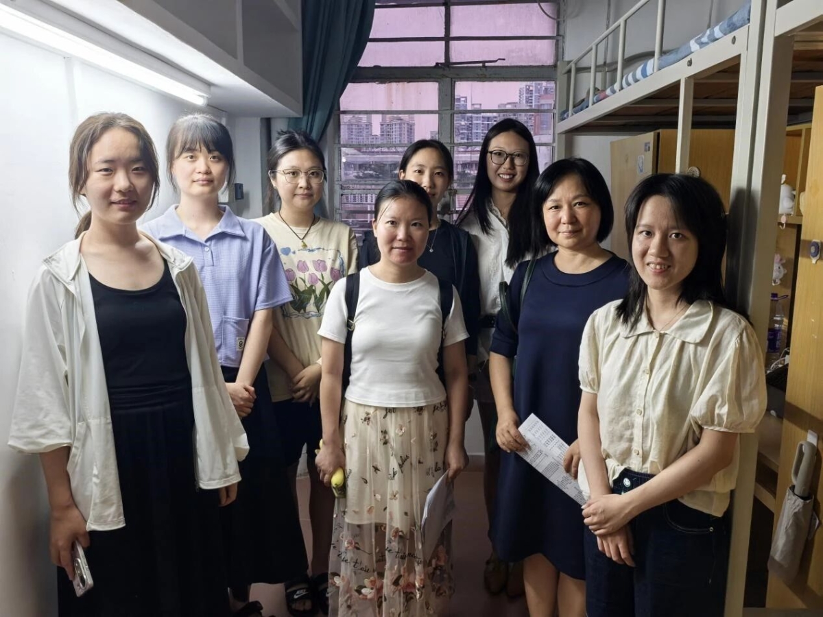 学院党委书记张东蕙(右二)与专硕班主任吴艳平讲师(左四)走访女生宿舍