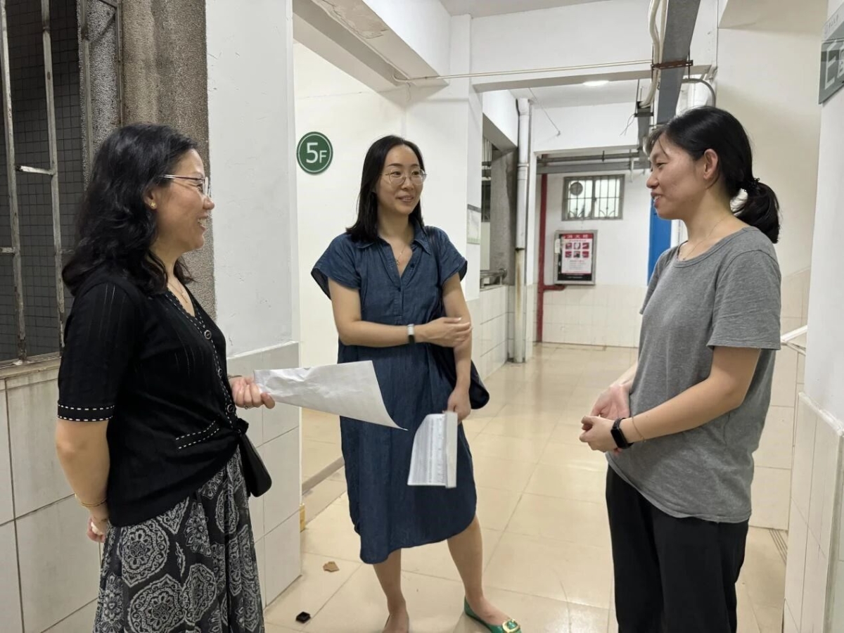 学院副院长王桃花教授(左一)与博士生班主任吕娜副教授(中)走访女生宿舍