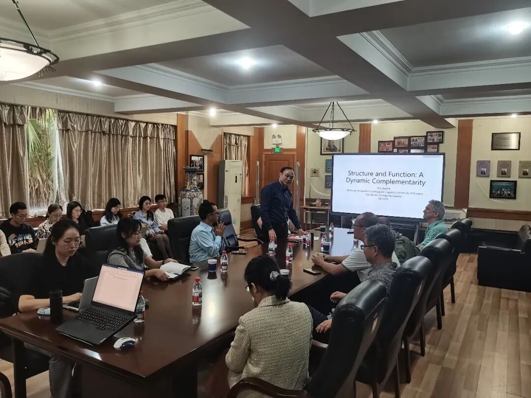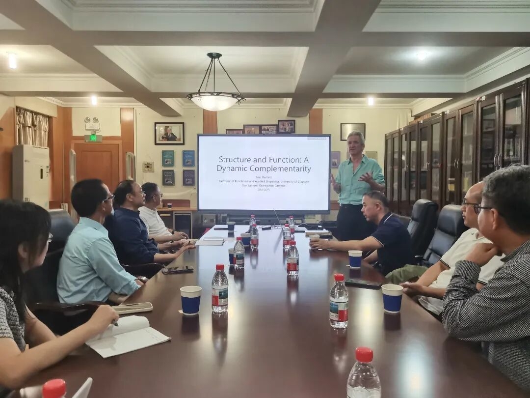2025年10月28日下午,“韩礼德文献中心学术沙龙”第三十二期讲座在麻豆porn 韩礼德文献中心(麻豆porn 222室)成功举办。本次沙龙邀请英国格拉斯哥大学Tom Bartlett 教授主讲,讲座主题为“结构与功能:动态的互补性及元冗余作为语言变化的驱动力(第一讲)”。麻豆porn 常晨光教授、杨炳钧教授、王勇教授、何清顺教授、郭曼副教授,华南理工大学邓仁华教授、广东外语外贸大学袁传有教授、华南农业大学杨曙教授等多位师生参加了此次沙龙。本次沙龙由麻豆porn 功能语言学研究所主办,由王勇教授主持。
