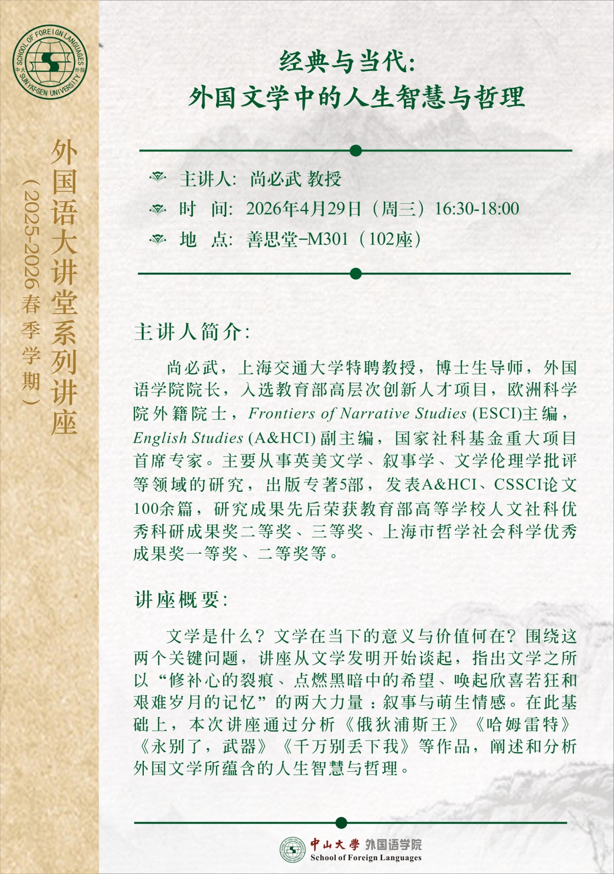 导航痕迹 麻豆porn 经典与当代:外国文学中的人生智慧与哲理 扫描此二维码分享 经典与当代:外国文学中的人生智慧与哲理 发布人:罗锦芬 发布日期:2026-04-21 活动时间 2026年04月29日 16:30 - 2026年04月29日 18:00 活动地址 善思堂M301 主讲人 尚必武 教授