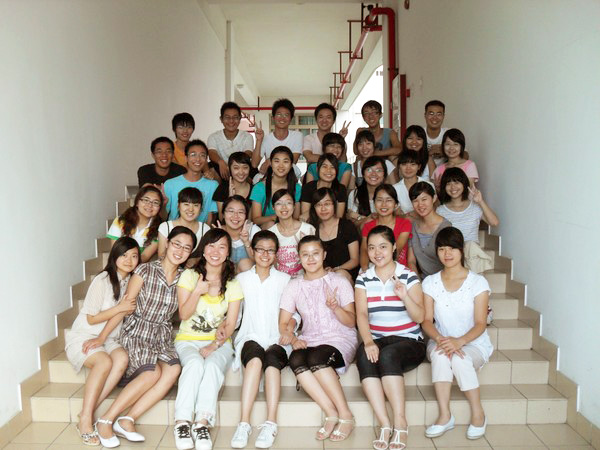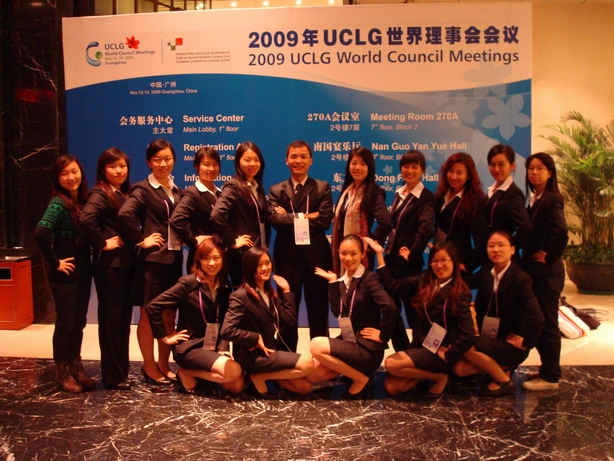 Etudiants-interprètes au Forum United Cities and Local Governments (UCLG) 2010 à Canton. Sur la photo, de gauche à droite au dernier rang : Lin Haiping (4ème), Li Shijun (6ème), Li Jie (8ème), Deng Qiu (10ème).