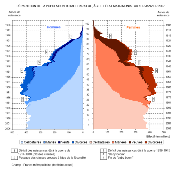 Le nombre de personnes habitant en France et dans les départements d'outre-mer (DOM) était estimé à environ 64,7 millions d'habitants au 1er janvier 2010. Ces personnes ont ainsi été réparties ainsi par âge, au 1erjanvier 2006, selon l'Insee :