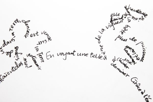 Les documents présentés ici sont des calligrammes, c'est-à-dire des poèmes dessinés. C'est à Guillaume Apollinaire (1880-1918) que nous devons le poème dessiné, dont les plus célèbres sont incontestablement le Poème à Lou et Il pleut.