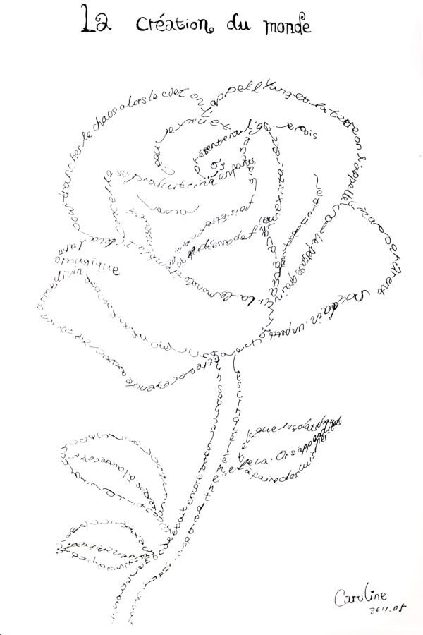 Il s’agissait pour les étudiants de faire une présentation par groupes sur leur compréhension du document et de proposer ainsi leur propre compréhension de la création du monde, en mobilisant à la fois à leurs connaissances et leur imagination, et de soumettre, en guise d’illustration, un calligramme représentatif de leur présentation.