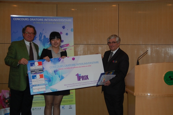 Monsieur Jean-Raphaël Peytregnet, Consul général de France, Monsieur François Rivest, Consul général du Canada, Monsieur Yan Guangmei, Sous-Directeur de notre université et Monsieur Chang Chenguang, Directeur de notre Institut étaient présents au concours, dont le thème était « Le Delta de la Rivière des Perles en 2050 ».